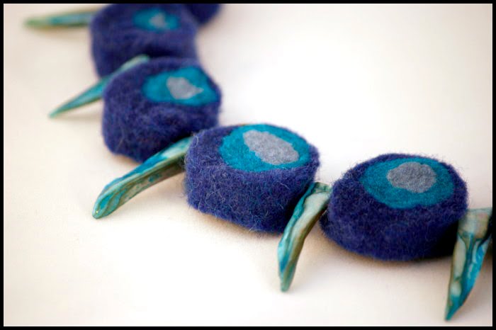 Handgjort halsband av tovade kulor i färgerna blå och turkos, varvade med trästavar på försilvrad smyckestråd.